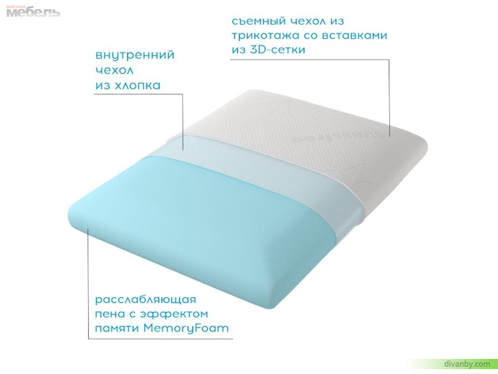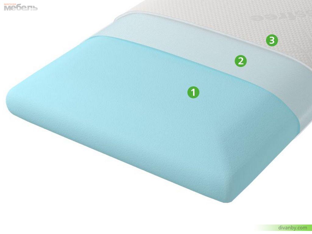 Наволочка - оболочка. Состоит из цельного пласта пены с эффектом памяти - MemoryFoam, дублированного хлопковым полотном.