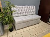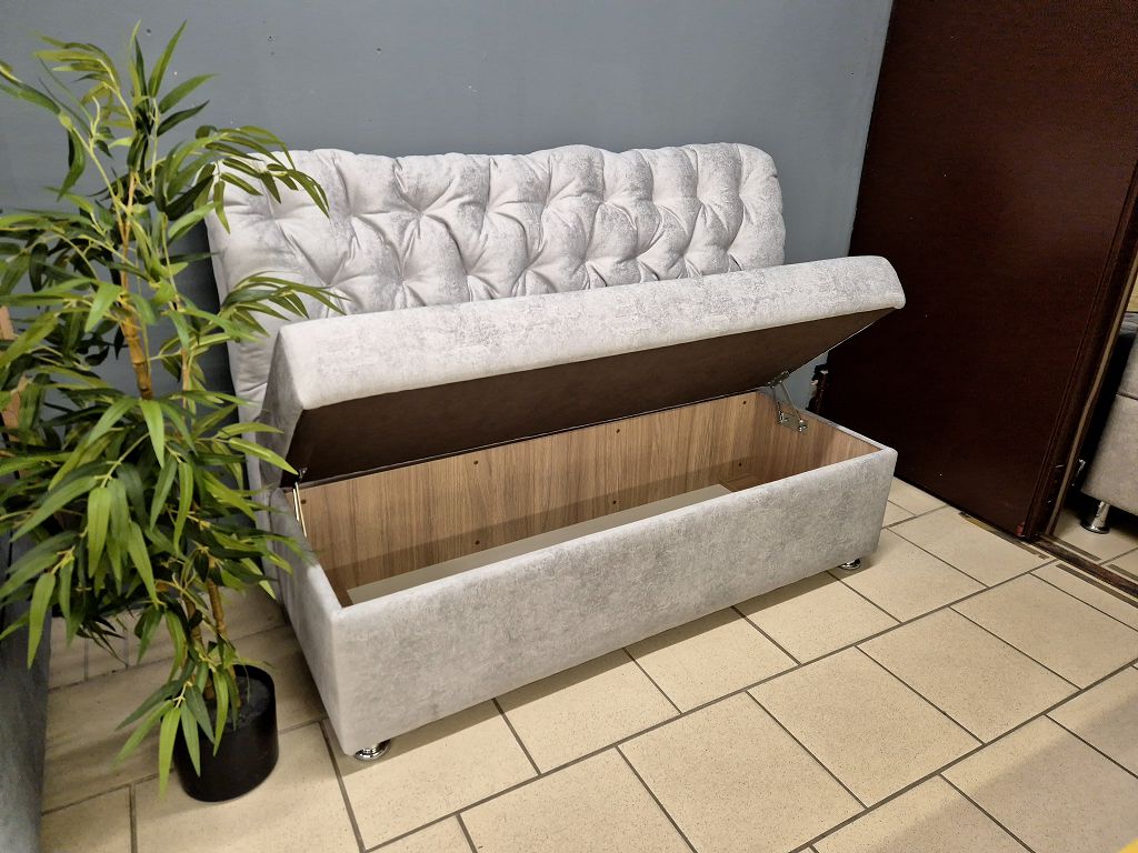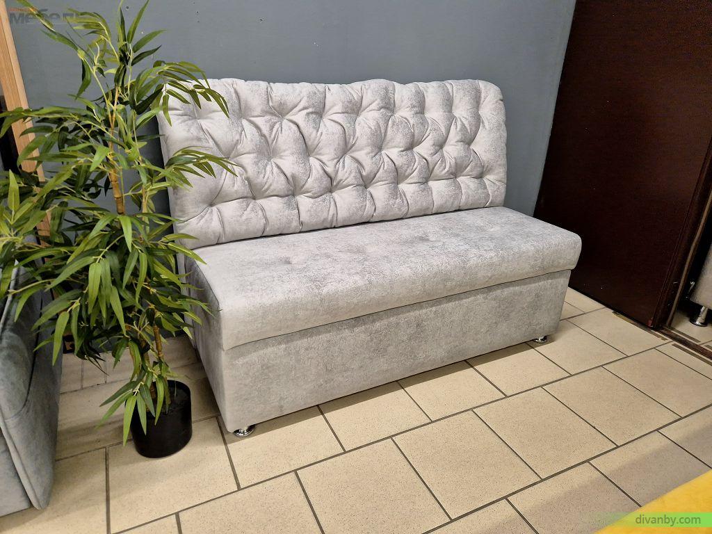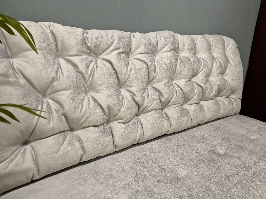 Спинка дивана декорирована каретной стяжкой и выглядит эффектно и солидно, создавая душевную и располагающую к общению атмосферу. Модель оснащена нишей для хранения.