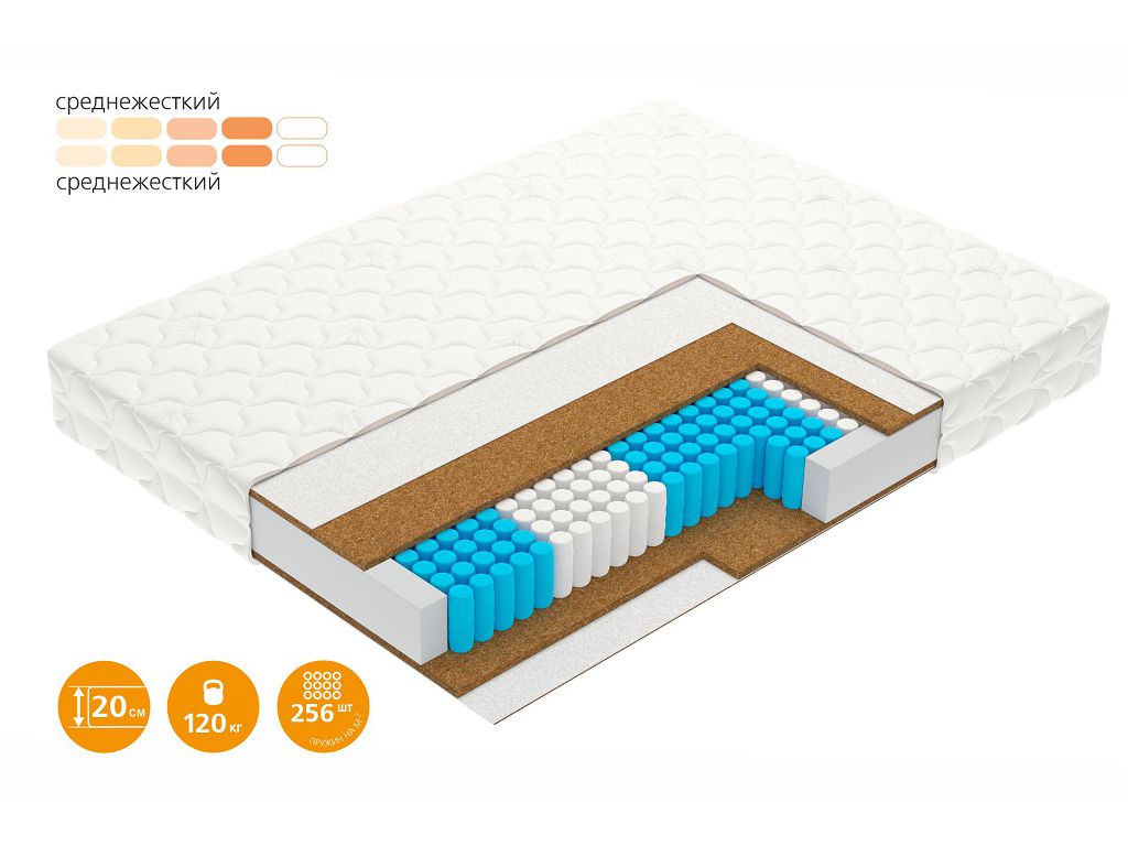 В этой модели жесткость кокосовой койры сбалансирована упругостью независимых 5-зональных пружин, гибко подстраивающихся под форму тела. Такая конструкция обеспечивает правильную жесткую поддержку, сохраняя комфорт отдыха. Матрас Focus – для тех, кто сосредоточен на заботе о здоровье.